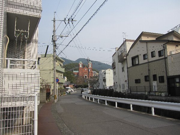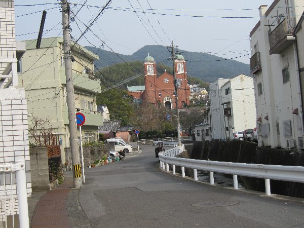 曲がりくねった道の向こうに神々しくそびえ立つ浦上天主堂