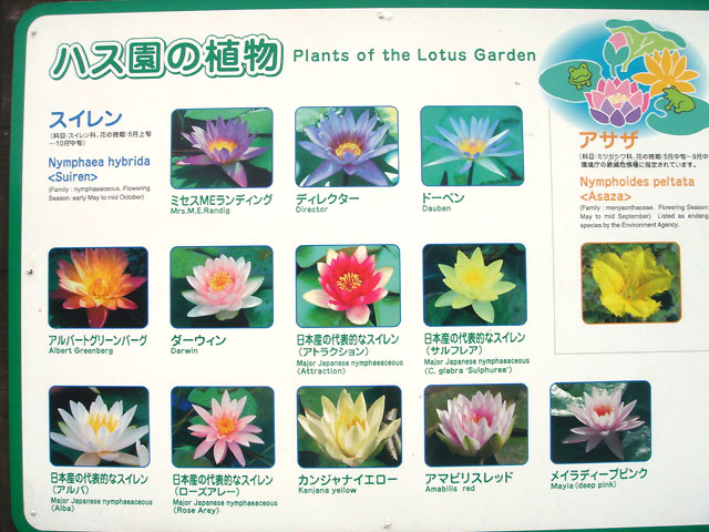 下の看板にあるように、ハスの花はもちろん、いろいろな種類のスイレンも楽しめます。