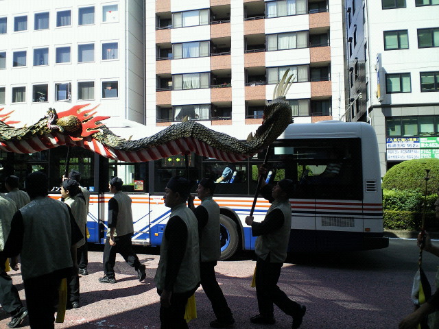 バスと一緒に龍が通過。