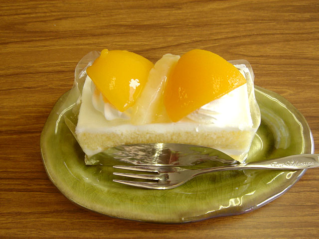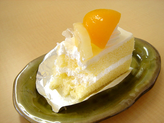 ・スポンジに生クリームが塗られ、パインと黄桃が乗っている
